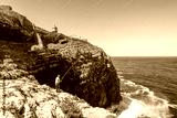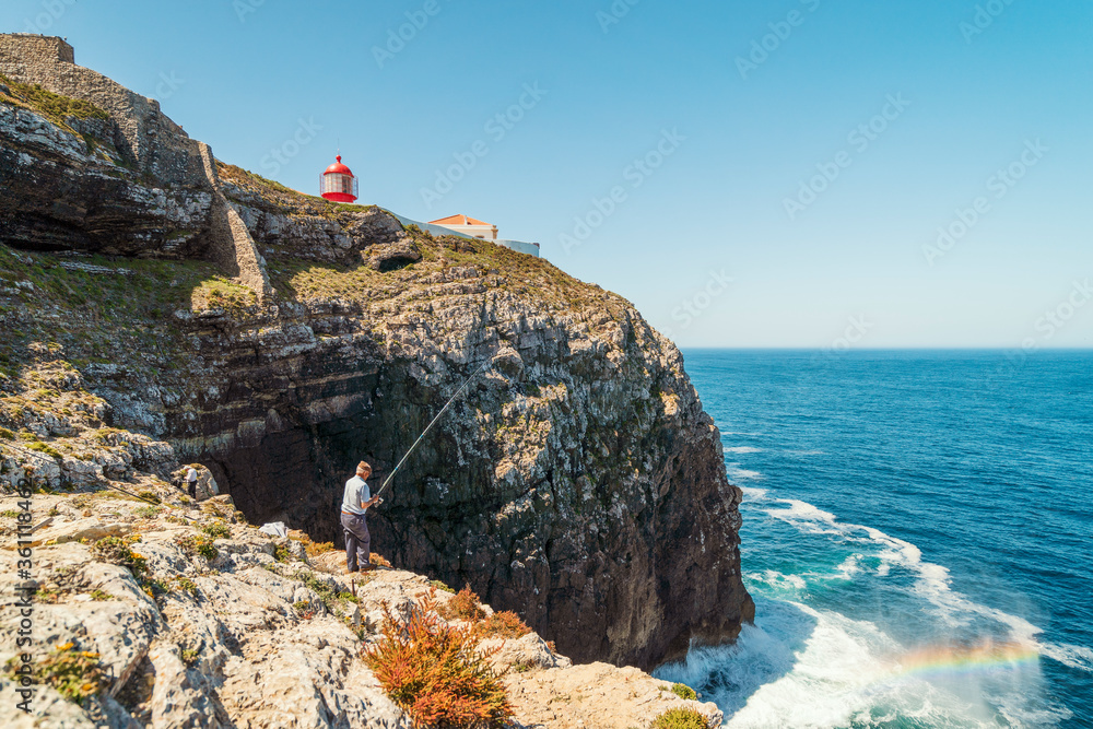 Elderly man fishing with a rod on high cliffs of Sao Vicente Cape, Portugal