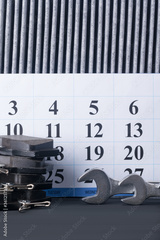 on the background of the calendar, a set of brake pads and a set of keys for removing and installing, there is a place at the top for the inscription on the air filter