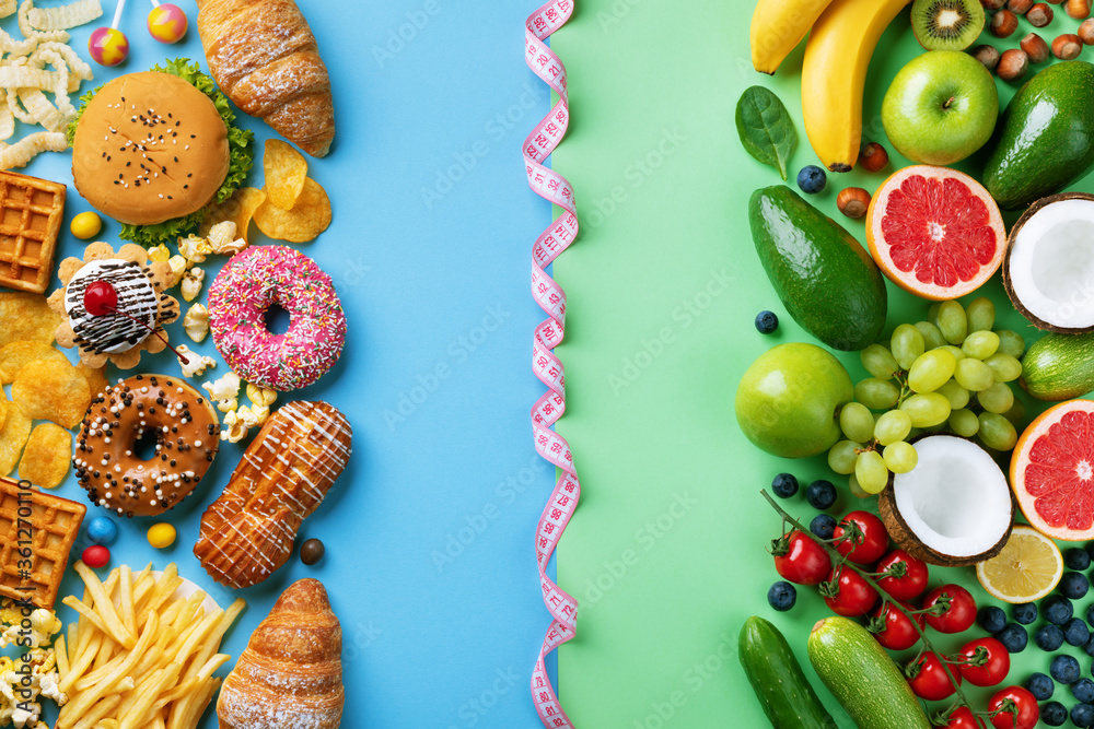 Healthy and unhealthy food background from fruits and vegetables vs fast food, sweets and pastry top view. Diet and detox against calorie and overweight lifestyle concept.