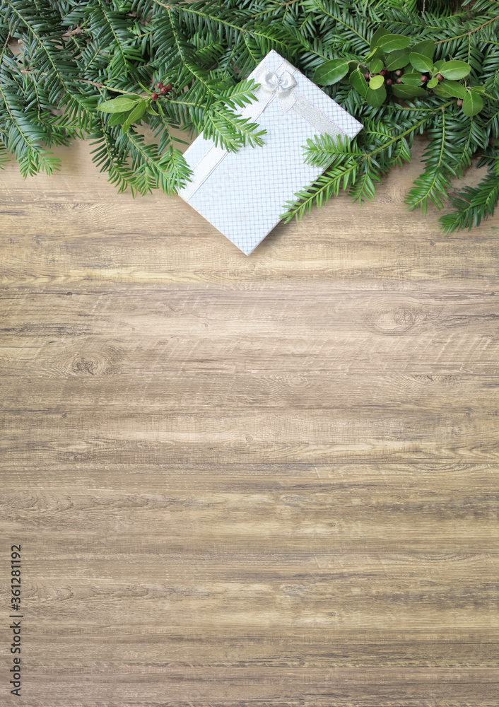 Fond de Noël avec sapin et cadeau sur planche de bois avec place pour le texte