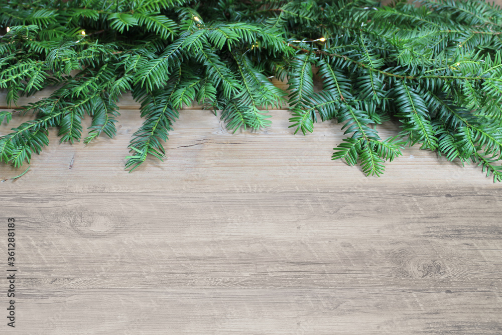 Fond de Noël avec branches de sapin sur planche de bois avec place pour le texte
