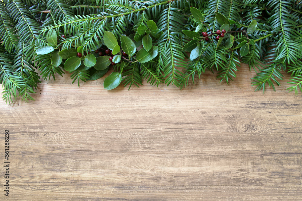 Fond de Noël avec branches de sapin sur planche de bois avec place pour le texte