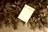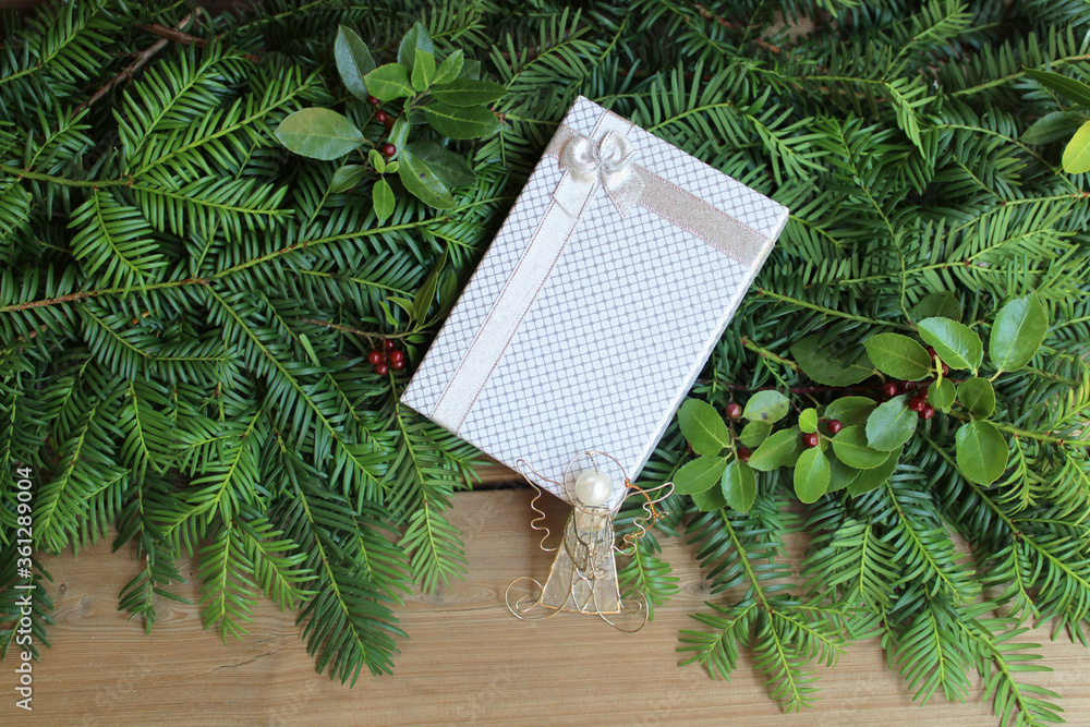 Cadeau de Noël nature dans branches de sapin sur planche de bois
