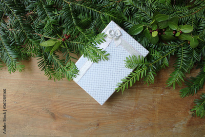 Cadeau de Noël nature dans branches de sapin sur planche de bois