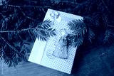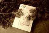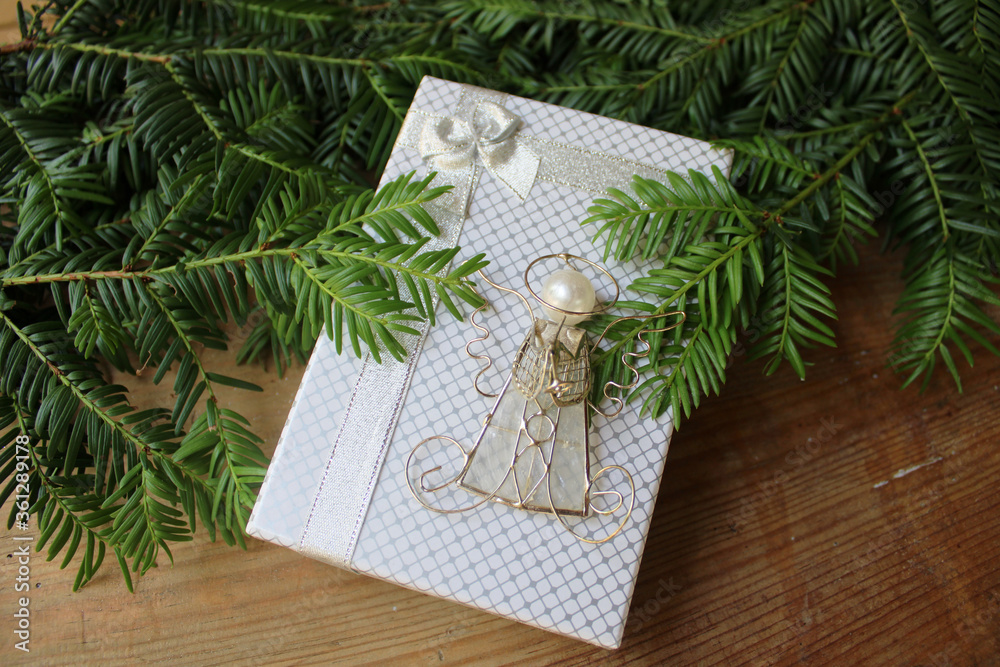 Cadeau de Noël nature dans branches de sapin sur planche de bois