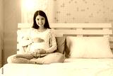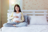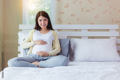 Happy pregnant mother touching beautiful belly with love, smile face on bed at home. prenatal, pregnancy, motherhood, expect concept. Young pregnancy girl and baby or fetus has good health, copy space
