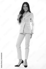 Asian, beautiful model with long hair in pink suit on studio shoot.