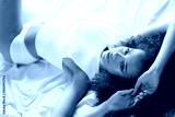 Happy afroamerican model lying on bed full of pillow. Nice smile.