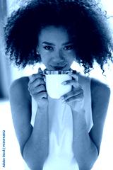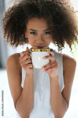 Good morning. Pretty afroamerican model with cup of coffee start a day in a bed. Model in white underwear.