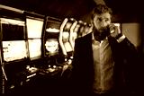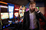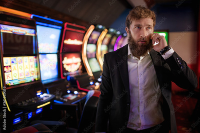 Young businessman in a casino stands and talks on a mobile. Elegant man near slots machines in a luxury casino interior.