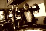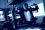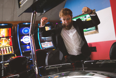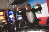 young man in a modern black suit stands next to a roulette machine and looks forward to winning at games of chance