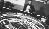 young man in a modern black suit stands next to a roulette machine and waits impatiently for a win