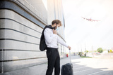 young businessman with a mascot on his face that prevents the spread of a pandemic caused by the corona virus goes on a trip to another country