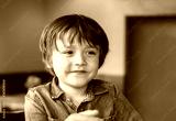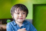 Portrait of happy little boy with smile sitting in the cafe waitting for food, Cheerful kid looking at camera with smling face, Positive childhood concept