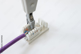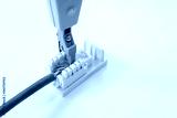 Close-up view of a networking cabling tool used to punchdown data cable wire to the back of a data outlet socket.