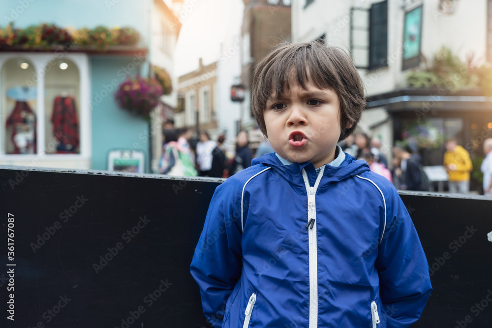 Outdoor portrait of young boy standing alone on street with with blurry background of people, Dramatic portrait of Kid with angry face .Spoiled children concept