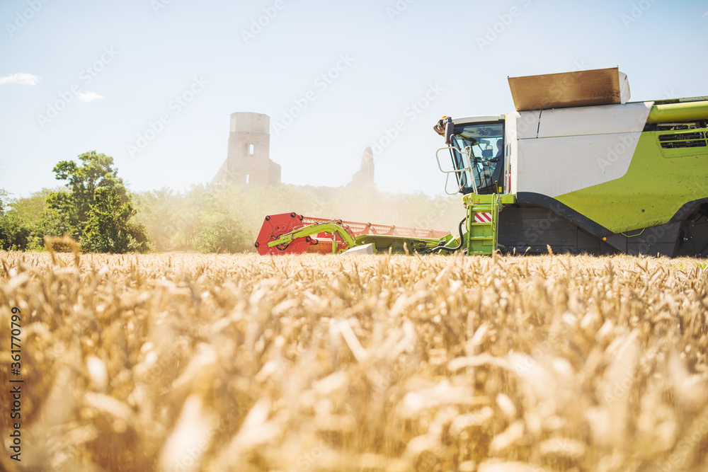 Against the backdrop of a sunny summer day and blue sky with clouds. Combine harvester harvesting ripe golden wheat on the field. The image of the agricultural industry