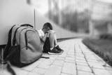 child with backpack in depression is sitting on the floor doesn't want back to school