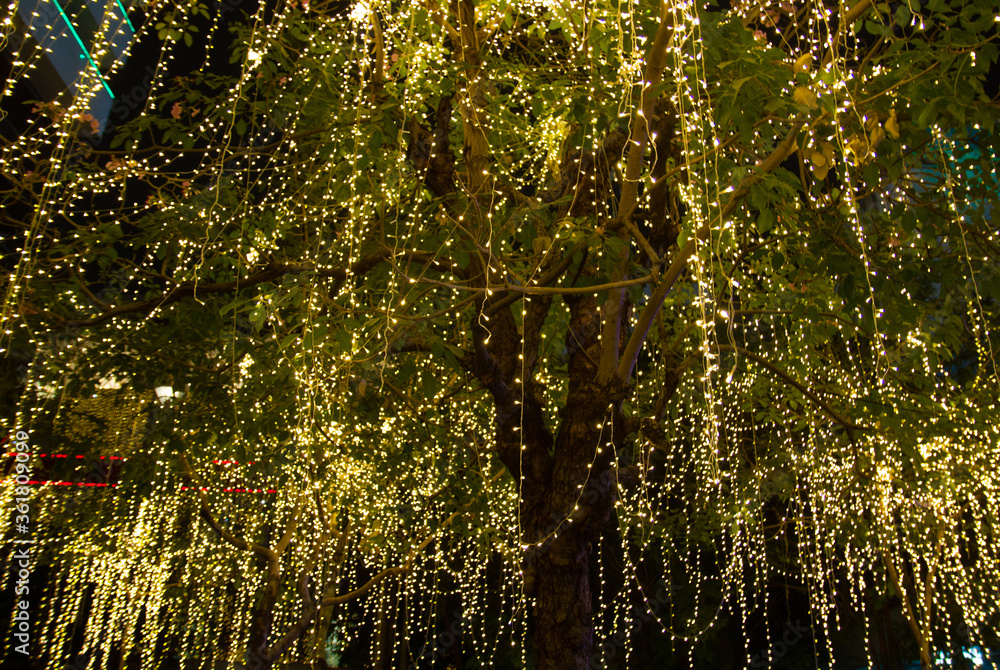 cable of string led lights on tree in the garden at night time used for decorating for beauty According to important festivals