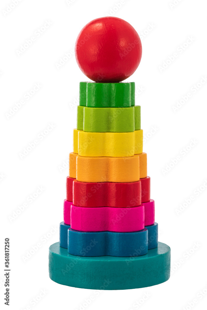 Wooden tower with rings, Montessori educational toy isolated on white background