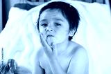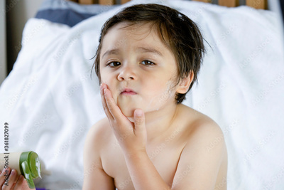 Portrait of cute little boy applying body lotion cream on his cheek after shower,Kid using cream for skincare protection,Child moisturize his dry skin, Children problem,hygiene,clean and fresh concept