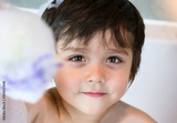 Close up face of adorable toddler boy taking a bath with a lot of bubbles in bathtub, Happy cute little boy playing with foam in the bathroom, Children Health care concept