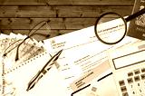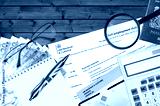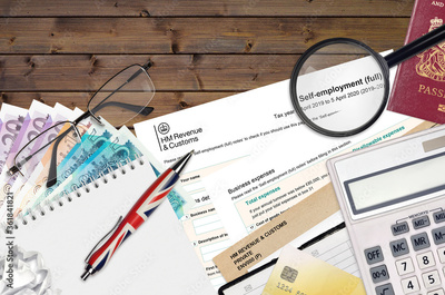 English Tax form sa103 Self-employment from HM revenue and customs lies on table with office items. HMRC paperwork and tax paying process in United Kingdom