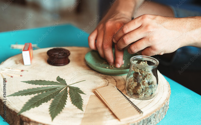 Young person preparing marijuana joint while rolling a pipe - Smooking cannabis weed concept - Main focus on left hand