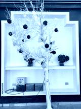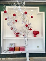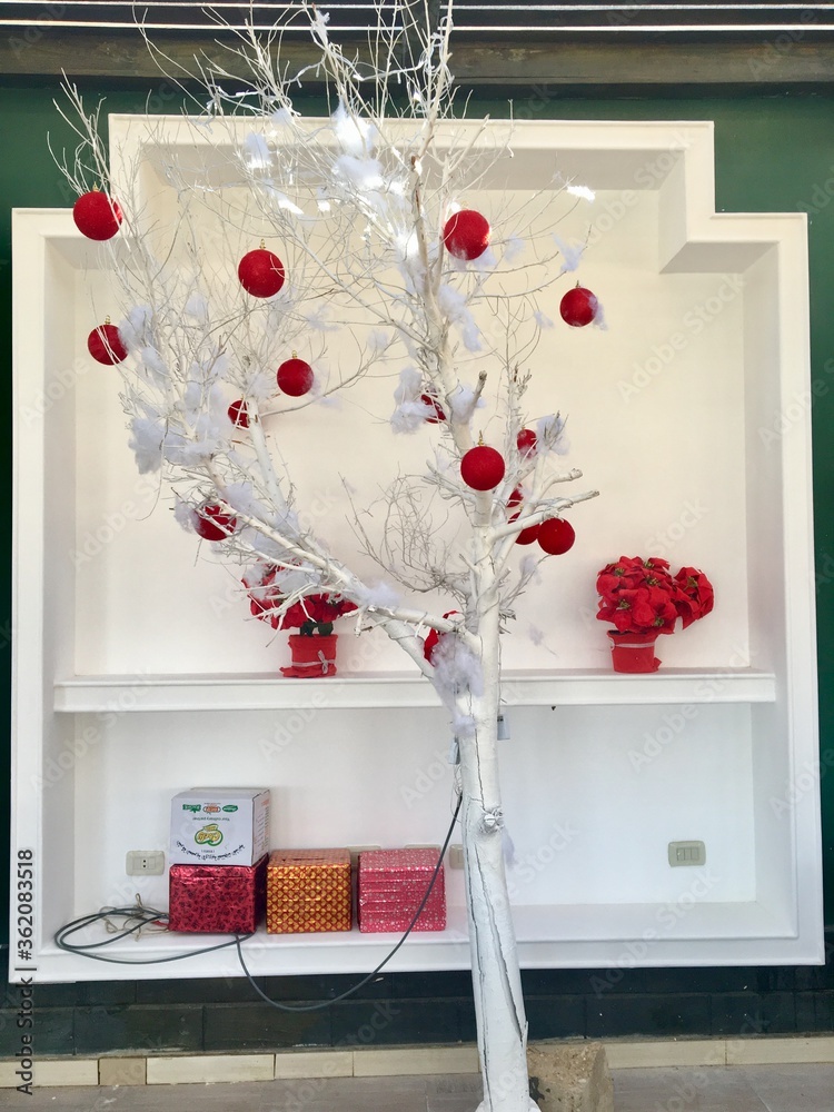 idea of a Christmas tree in a hot country is very interesting. A tree branch painted with white paint, decorated with a white fluffy garland and red toy balls