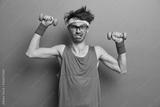 Be strong and healthy. Unhappy man lifts heavy dumbbells, practices weight lifting, has workout with sport equipment, wears red shirt and wristband, poses against green background. Successful training