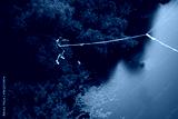 Concept of Extreme Sports and Fun. The man is a thrill-seeker and a rope jumper from the bridge. He is very happy to make a dream come true. He is holding an action camera and insanely happy