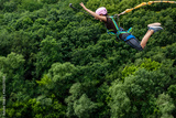 Ivanovsky Bridge, Ukraine - June 21, 2020: Concept of Extreme Sport. The girl is doing rope jumping from the bridge. She is happy to make a dream come true. She is very free in this moment