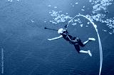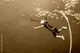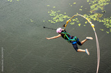 Ivanovsky Bridge, Ukraine - June 21, 2020: Concept of Extreme Sport. The girl is doing rope jumping from the bridge. She is happy to make a dream come true. She is very free in this moment