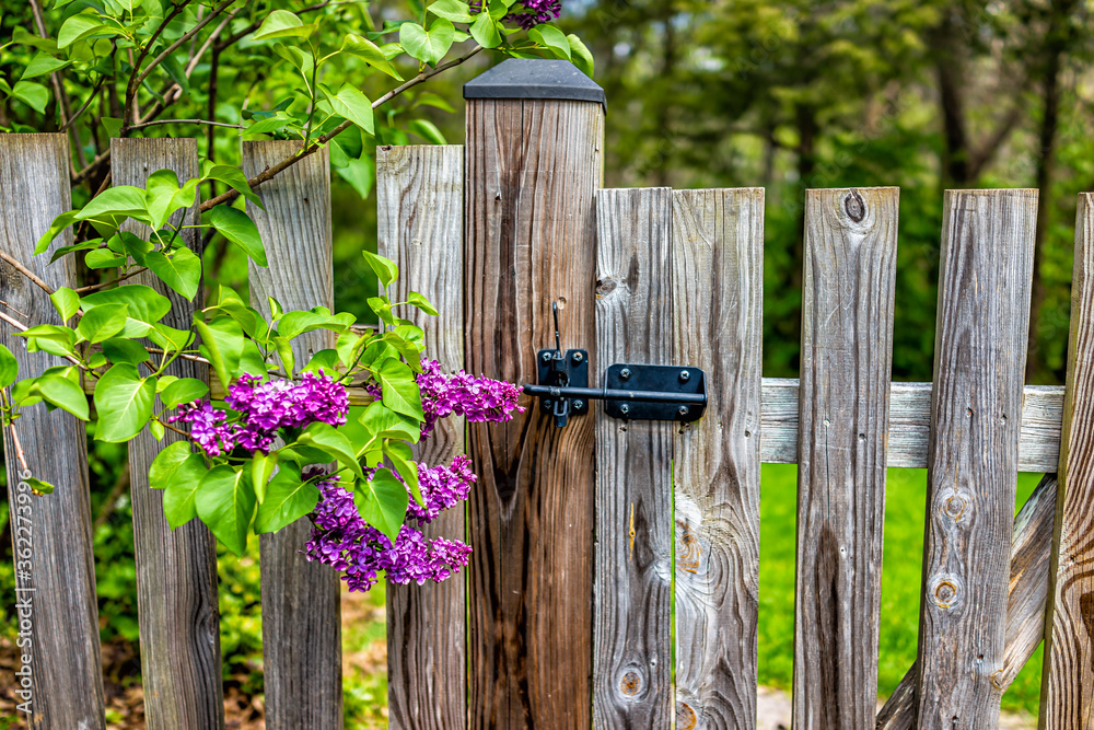 Idyllic peaceful garden in Virginia with closed wooden fence door gate entrance by purple spring springtime lilac flowers on tree and nobody