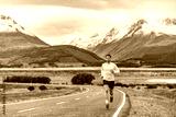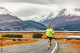 Athlete runner running road race in amazing mountain range landscape in New Zealand. Man run exercise long distance cardio training outdoors in cold fall weather.