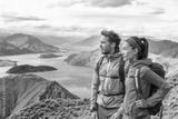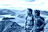 Hiking couple wanderlust adventure and travel concept with hikers relaxing looking at view. Hiking couple tramping up famous hike to Roys Peak on South Island, New Zealand.