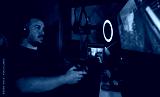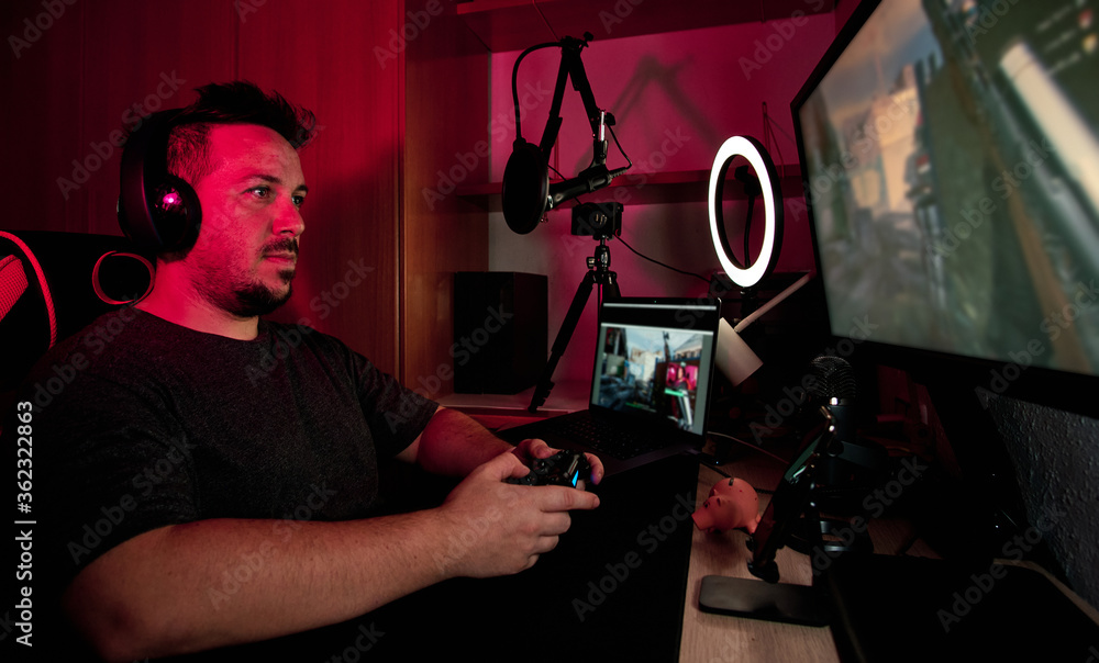 a gamer playing and streaming live with microphones and cameras