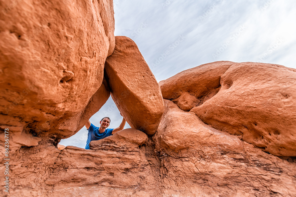 Man hiking low angle view behind framing hoodoo sandstone rock formations happy in desert landscape in Goblin Valley State Park in Utah on trail