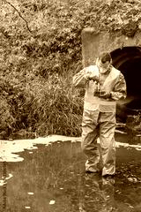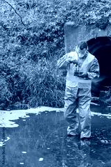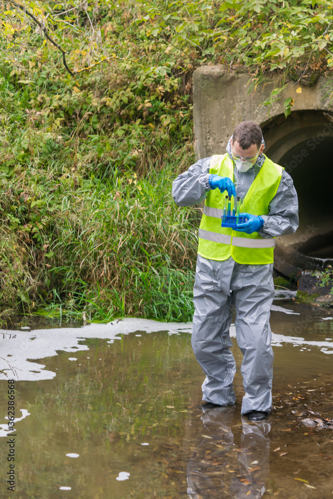 a man in a protective suit and a respirator in goggles holds in his hands test tubes with reagents and test samples in the open air in an unfavorable area on the river