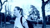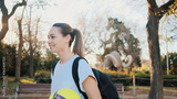 Beautiful girl with backpack and football walking through city park after morning training outdoor