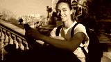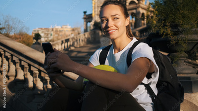 Gorgeous sporty girl with football happily resting after training on old stairs in city park. Attractive girl using smartphone outdoor
