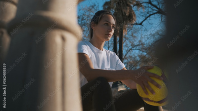 Conceptual portrait of confident sporty girl with football resting on stairs in city park