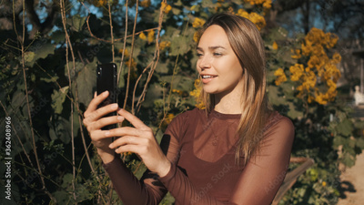 Attractive stylish girl happily talking with friends on video chat while walking along park. Pretty girl using phone outdoor