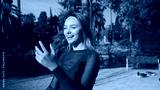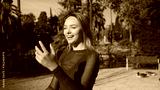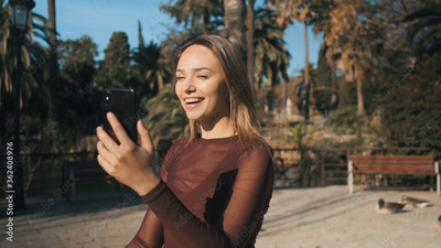 Beautiful cheerful girl using smartphone happily talking with friends on video chat while walking along park