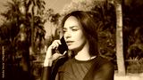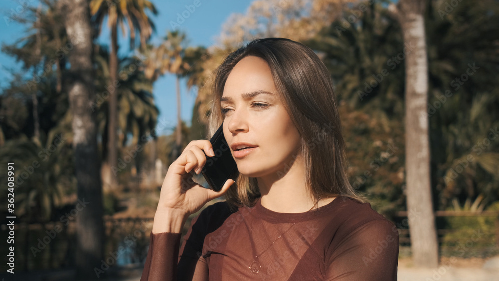 Attractive girl talking on smartphone in city park. Beautiful serious girl using phone outdoor