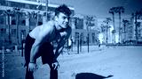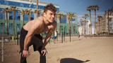 Young handsome smiling sporty man with wireless earphones resting during workout on beach