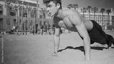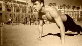 Young handsome sporty guy pushing-up during functional training on beach. Attractive guy on workout