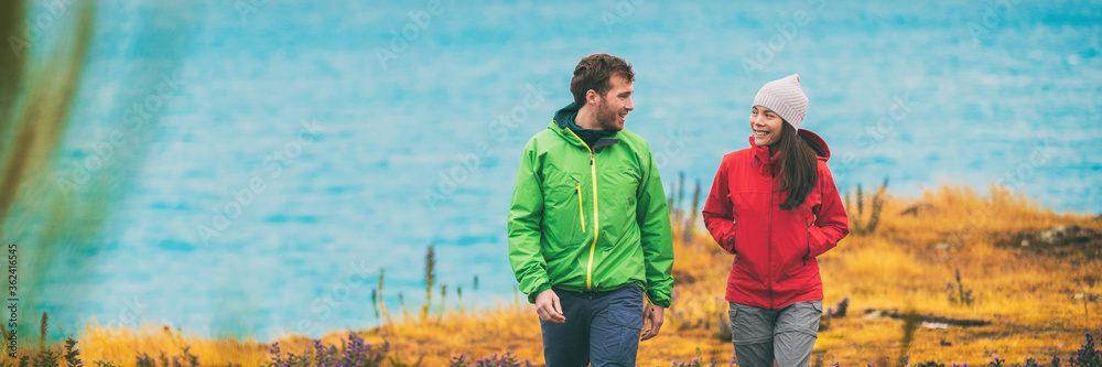 New Zealand travel - couple tourists hiking at nature view of Lake Pukaki near Aoraki aka Mount Cook, a famous travel road trip tourist destination. Panoramic banner of young couple hiking in nature.