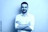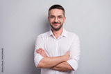 Close-up portrait of his he nice attractive cheery content mature man skilled qualified banker financier specialist wearing specs folded arms isolated over light gray pastel color background