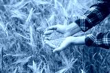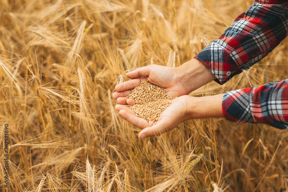Hands farmer pours a handful of wheat grain on a wheat field. Agriculture and harvesting business concept.